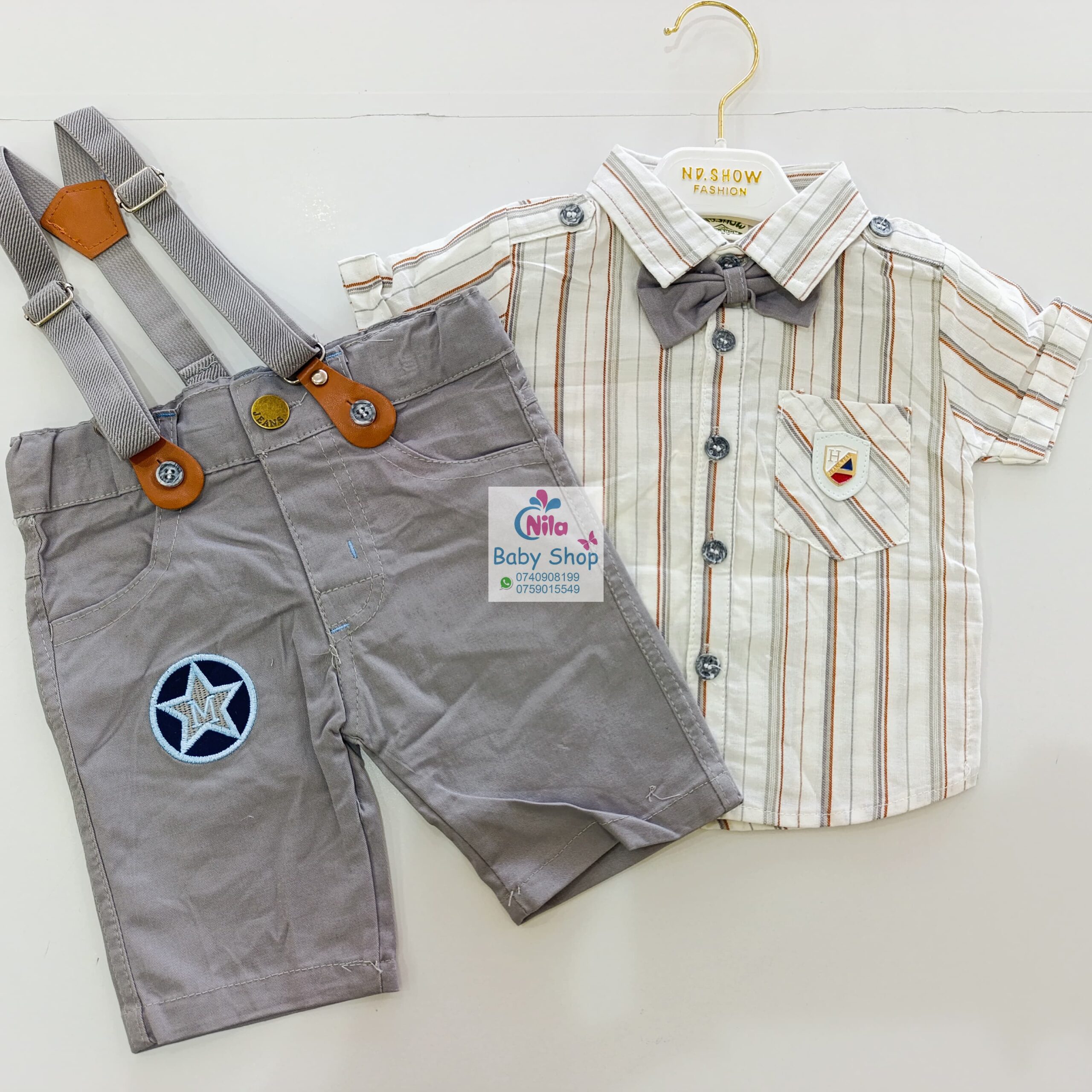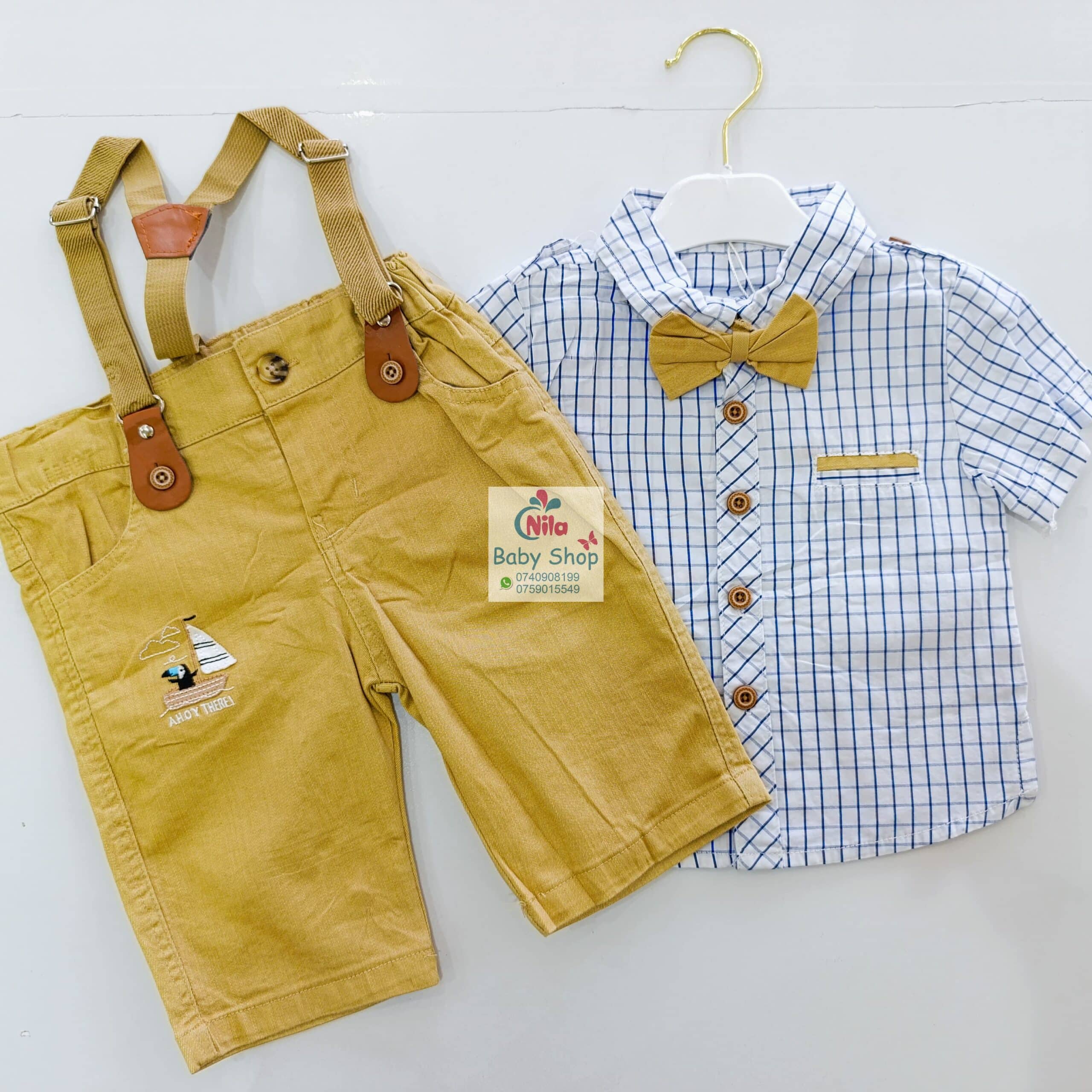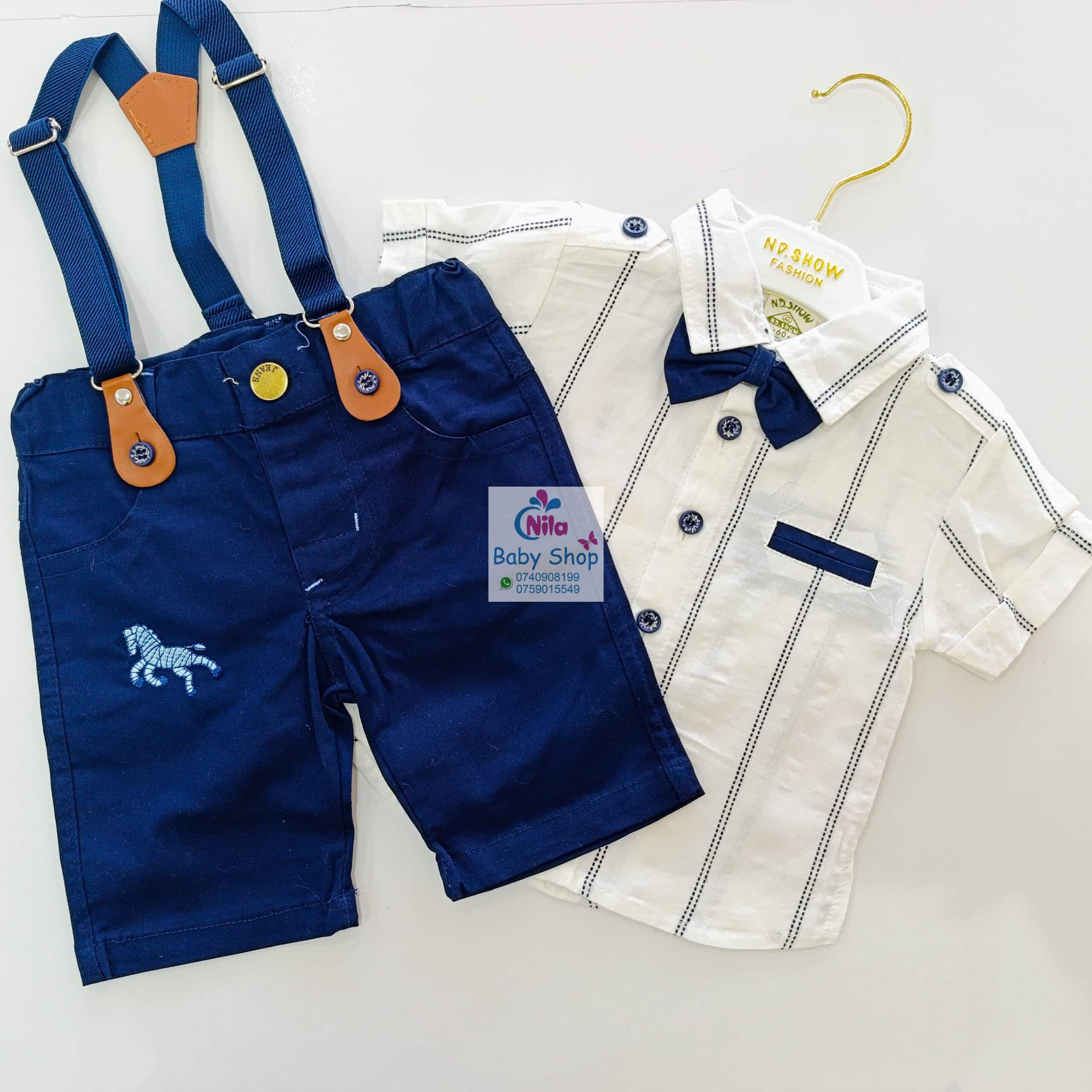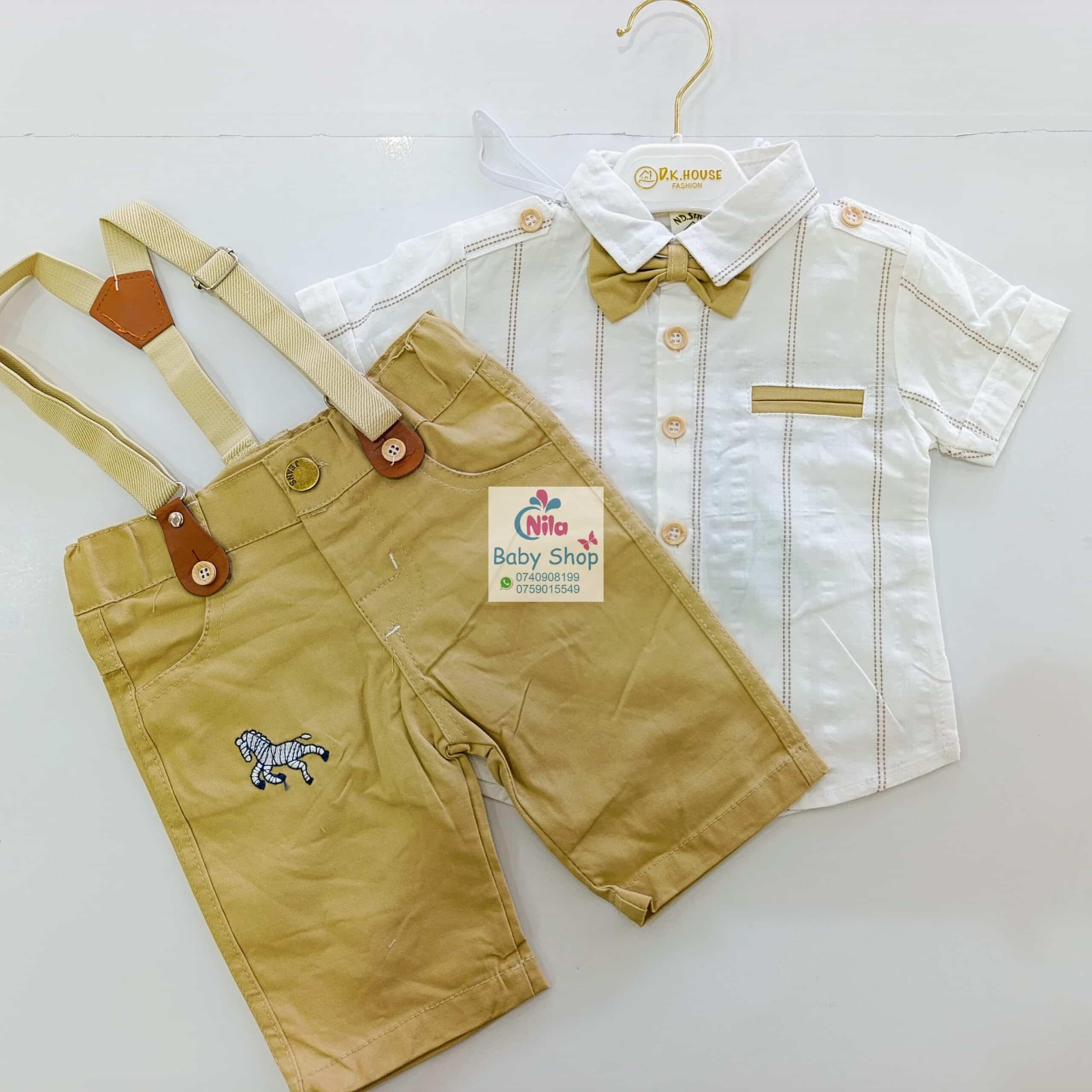 High Quality Baby Boy Suspender Khaki Shorts With Shirt & Bow Tie