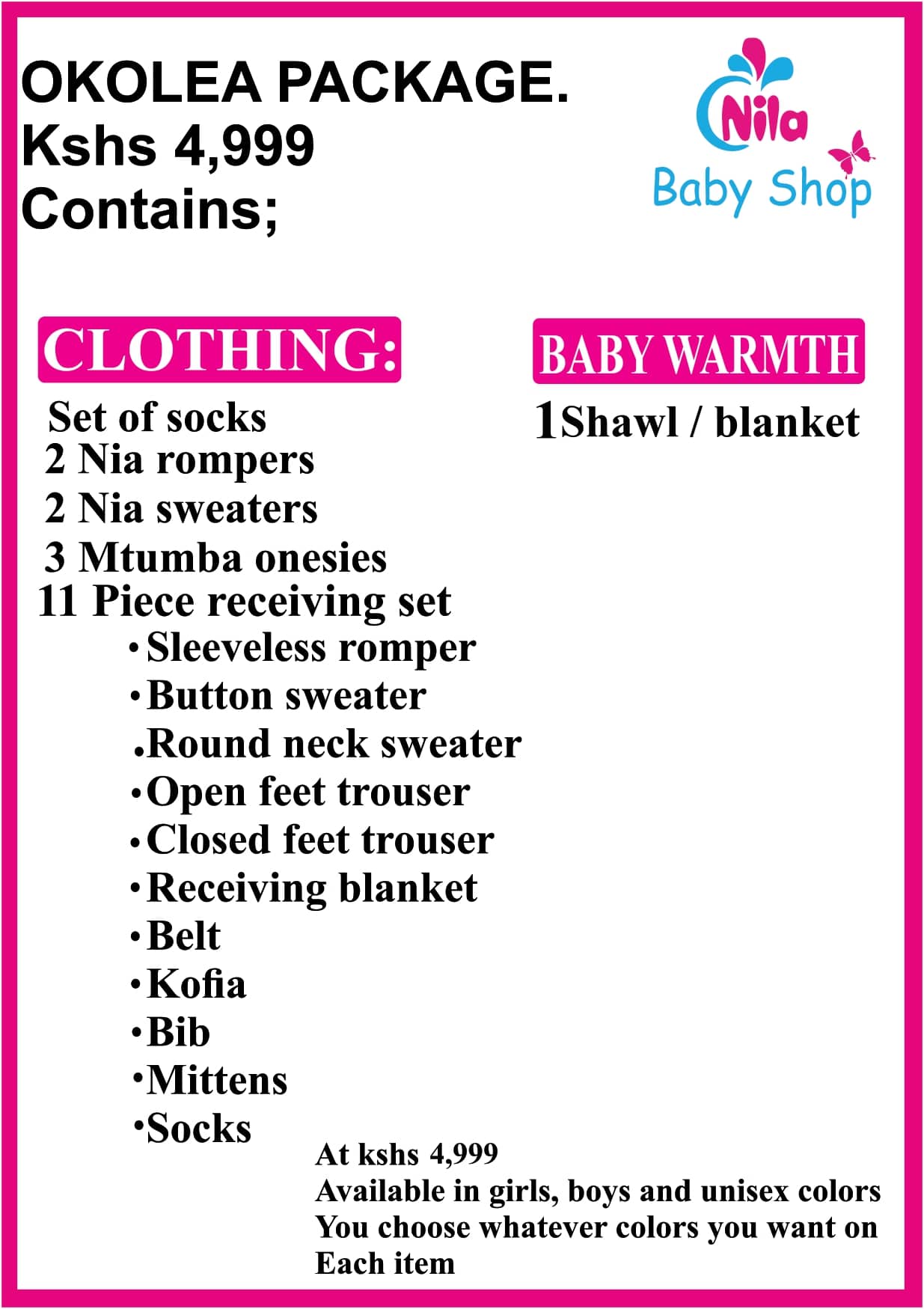 Available in girls’, boys’, and unisex colors. You choose the colors you want for each item, so the package feels personal, not pre-packed.